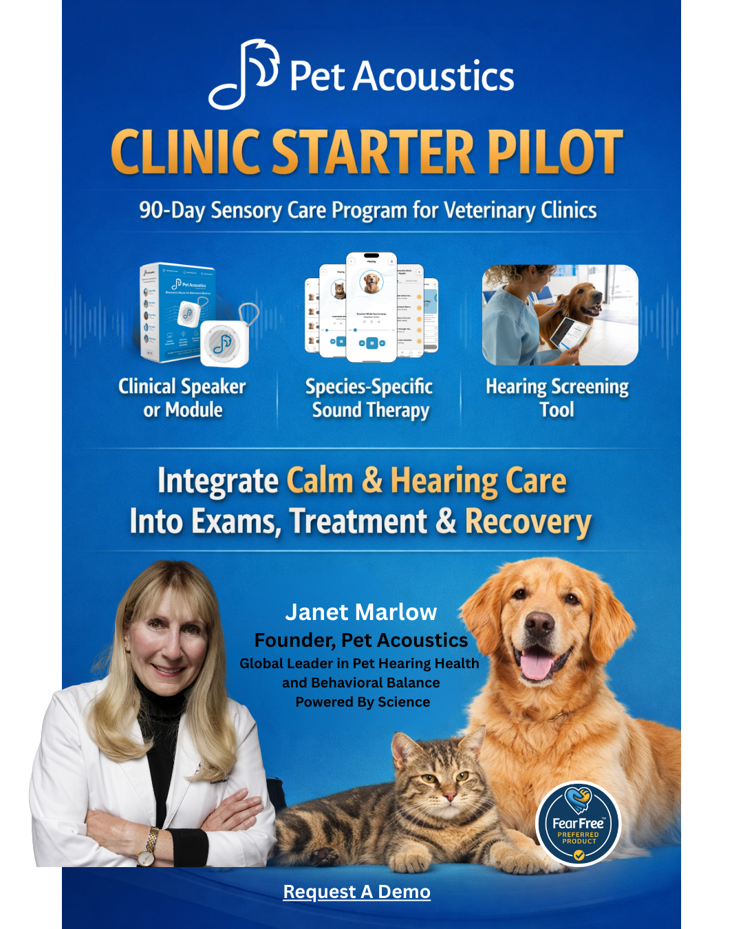 Pet Acoustics helps veterinary teams reduce stress in dogs and cats through species-specific sound therapy, and supports hearing wellness with a non-invasive screening experience—easy to adopt, no integration required.